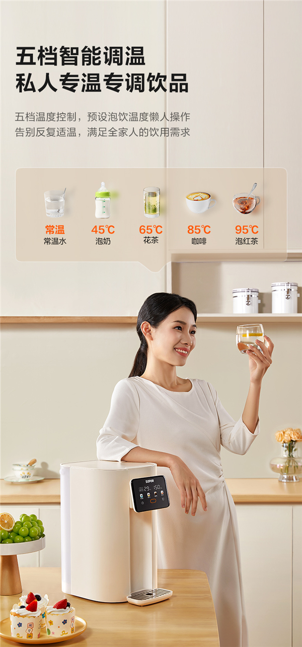 苏泊尔净饮机UT01对于泡茶温度更加讲究。内置五档调温设计,常温、45°C冲奶、65°C花茶、85°C绿茶、95°C红茶,适宜的水温能够让茶叶的香气更加浓郁。即热式加热方式,无需久等,无论在忙都能轻松享用上一杯热乎的“功夫茶”,品尝花茶的芬芳,绿茶的鲜爽、红茶的醇香。哪怕临时要出门,也无需盯着倒水,150ml奶瓶、500ml水杯、300ml马克杯,以及999ml运动水壶四种定量取水档,随取随用,减少等待时间。