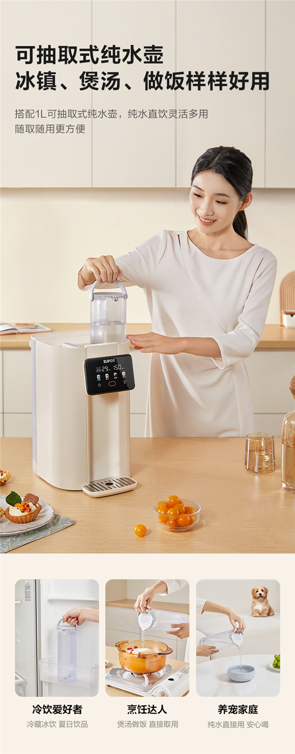 生活不仅有诗和远方,还有当下的生活琐碎。苏泊尔净饮机UT01将净水、直饮、生活用水三合一,一机满足直饮、煲汤、洗蔬果等多样用水需求。内置1L可抽取式纯水壶,拿取轻松方便,可以提前备水,烹饪时随取随用,节省时间,清洗便捷,也可以直接用水壶装好放进冰箱,也能实现果茶冷饮畅饮。苏泊尔净饮机UT01将净饮机从单纯的饮水机拓展成了全功能净水器,实现净水自由。
