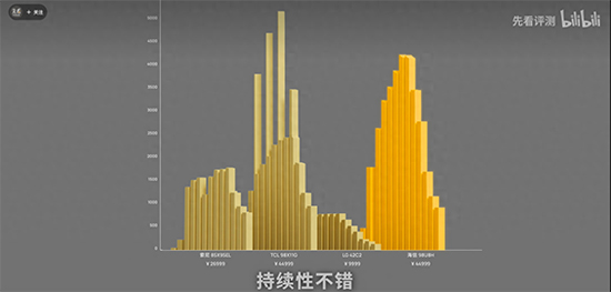 再看TCL X11G,高亮度在2000尼特左右,且持续性有待提升,城市柱状图称“避雷针”式分布。索尼的柱状图持续性不错但亮度较低。