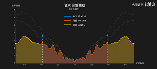 通过色彩偏差的实测,也验证了这一点。在色彩偏差上,海信电视U8H在小角度下表现最好,超过40°。SONY X955L花大成本覆盖的可视角度膜效果更优,但缺点也很明显,那就是削弱电视亮度。