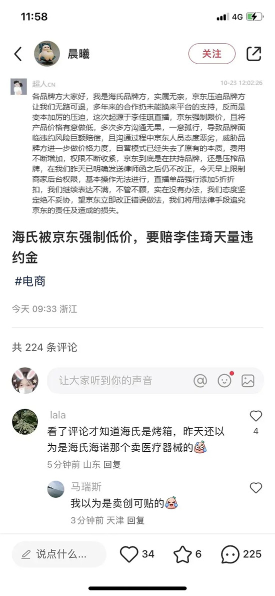 2023年10月24日上午,小红书上有网友晒出朋友圈截图。自称是海氏品牌方的微信用户“超人CN”发朋友圈称:海氏与李佳琦达成双11合作,京东强行跟价,导致京东平台的某款海氏产品价格低于李佳琦直播间。因而海氏将会面临来自李佳琦的巨额索赔。对此,海氏要求京东修正错误。如果京东一意孤行,海氏在律师函后,还会起诉京东。 海氏相关工作人员的全文矛头直指京东,但实际上索要巨款的却是李佳琦。这说明:京东是真实惠啊!
