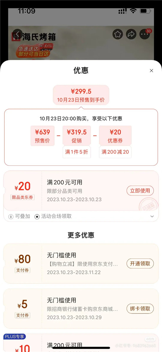 随即有消费者晒出订单,订单显示,10月23日,在京东的双11预售活动中,购买海氏品牌烤箱C40,一件5折且可以叠加200-20的东券,最终实付价格为299.5元。