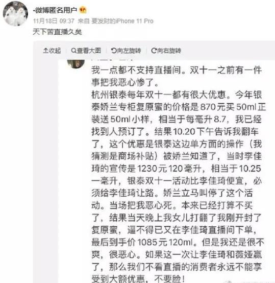 李佳琦的垄断史最早始于银泰娇兰事件。在2021年,有网友发双11前发出购买攻略,表示银泰的娇兰等产品,其线下活动比李佳琦直播间更划算,并且不需要在直播间守候,也不需要抢购。