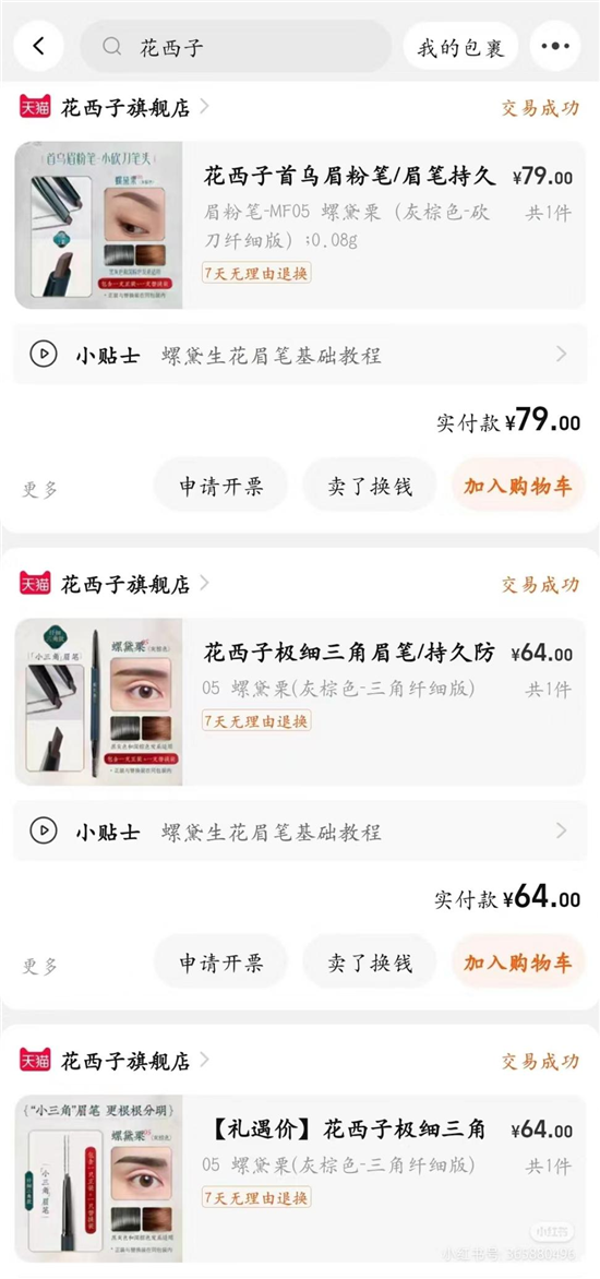 事件发酵后,有网友找出自己的购买截图,花西子确实是从64涨到了79。并且,有网友计算得出,花西子眉笔每克单价达到了980元,单价远高于黄金。
