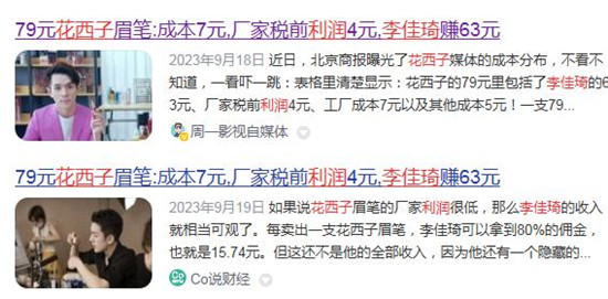 与此同时,有网友爆料称:疑似花西子79元的眉笔中,63元都让李佳琦赚了,7元的成本后花西子仅赚4元。目前该爆料并没有切实有效的证据。