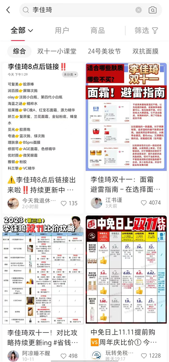与2021年银泰事件时不同,2023年的双11前,网友已经开始质疑李佳琦的所谓“低价”了。现在打开小红书,搜索李佳琦,前四条有三条都是在比较,并且有不少商品价格确实比李佳琦更低。并且,在这些笔记下,也不像往年那样充满了李佳琦粉丝“执法”——扬言要告诉李佳琦,消费者趋于理性化是肉眼可见的。李佳琦直播间的垄断还在继续,依旧有源源不断的品牌与他合作,当然,也不免有急的跳脚的海氏,为其创造新的增收项。