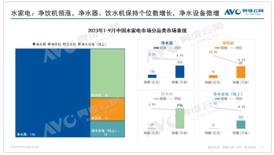 今年前三季度,水家电市场表现突出,迎来复苏。奥维云网(AVC)推总数据显示,2023年1-9月水家电(净水器,净饮机,饮水机,净水设备)规模为199亿(其中,净水设备只含线上)。净水器市场大通量产品升级,线上线下渠道端加快复苏,2023M1-9净水器全渠道零售规模为136亿元,零售量532万台,分别同比上升8.0%和6.4%;净饮机市场内部产品、结构升级,2023M1-9净饮机全渠道零售规模为16亿元,零售量65万台,分别同比上升23.4%和下降5%;饮水机市场中茶吧机份额逐步扩大,净水套餐的热卖助力管线机市场增长,2023M1-9饮水机全渠道零售规模为35亿元,零售量884万台,分别同比上升5.9%和1.5%;净水设备市场线上以前置过滤器和龙头式净水为主,2023M1-9净水设备线上零售规模为12亿元,零售量352万台,分别同比上升1.1%和下降8.5%。