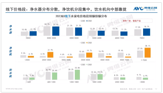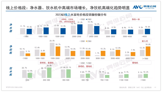 2、水温纵向延伸:23M1-9线上净热一体净水器份额占比达到11.9%,同比增加5.8%,净饮机中能够制冷的冰热产品份额达到17.3%,份额同比增加10.7%。纵向延伸水温的水家电产品逐步增多。
