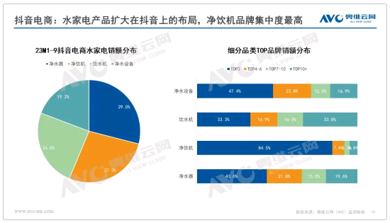 奥维云网(AVC)监测数据显示,23年1-9月抖音电商中水家电的销额分布比较均匀,净水器占比最大,达到29%,其次是净饮机(27.3%),饮水机(24.5%),最后是净水设备(19.2%),其中,净饮机的头部品牌集中度最高。从细分产品类型来说,抖音电商上饮水机主销品类是茶吧机,净水设备主销品类是龙头式净水器,净饮机中主要是台式净饮机,强展示性、易上手、便捷操作等特性使得这类免安装的水家电产品持续热销。