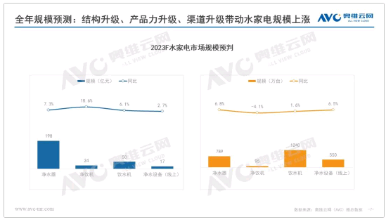 整体来看,水家电市场不断进行结构升级,持续打造产品力,奥维云网(AVC)预测,2023净水器全渠道零售额规模为198亿元,同比增长7.3%,全渠道零售量规模为789万台,同比增长6.8%;净饮机全渠道零售额规模为24亿元,同比增长18.6%,全渠道零售量规模为95万台,同比下降4.1%;饮水机全渠道零售额规模为50亿元,同比增长6.1%,全渠道零售量规模为1240万台,同比增长1.6%;净水设备线上零售额规模为17亿元,同比增长2.7%,线上零售量规模为550万台,同比增长6.5%。