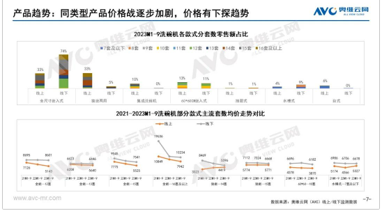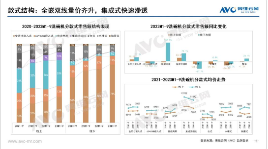 此外,近年来集成洗碗机受到广泛关注,不断有品牌涌入这一新的集成赛道,集成式快速渗透。据奥维云网(AVC)监测数据,2023年1-9月,集成洗碗机线上市场在售品牌数量达到110家,与全尺寸嵌入式并列为品牌数量最多的款式;线上市场零售额占比达9.8%,较上年同期上涨2.5个百分点。与此同时,集成洗碗机的均价持续下降,渗透率有望进一步提升。