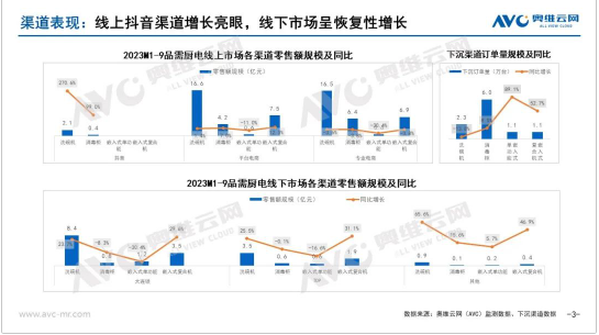 Z世代作为品需厨电目前的消费主力,更加偏好线上购物,线上消费持续升温,其中抖音等兴趣电商增长亮眼。根据奥维云网(AVC)监测数据,2023年1-9月洗碗机、消毒柜抖音渠道零售额分别同比增长270.6%、99.0%。线下渠道则由于疫情放开,门店快速复苏,增长明显,预计Q4线下将延续高增长态势。