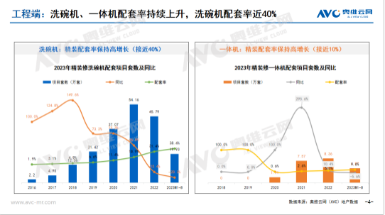 近年来,以洗碗机、一体机为代表的品需厨电配置率保持上升趋势,根据奥维云网(AVC)地产大数据显示,2023年1-8月洗碗机、一体机的配套率分别达到38.4%和9.6%,较2022年全年分别提升7.0个百分点、3.9个百分点。近年来居民对家电的升级需求旺盛,而洗碗机、一体机作为改善型厨电,品质化标签明显,溢价能力强,预计洗碗机、一体机工程市场仍将持续向好。