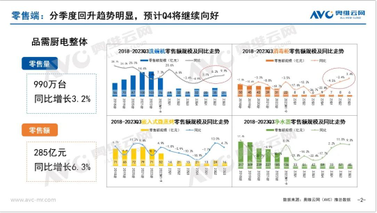 三年疫情重塑国民健康态度、产品需求,叠加外部健康环境的不确定性,消费者对于健康类家电的需求仍在增加,利好消毒柜行业的发展,2023年消毒柜行业整体也迎来触底反弹。根据奥维云网(AVC)推总数据,2023年1-9月消毒柜零售额22亿元,同比下降3.5%;分季度来看,消毒柜从Q1至Q3同比增速分别为-9.5%、-2.4%、3.4%,由降转增,整体形势继续向好。