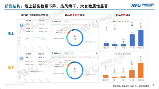 从新品数量来看,线上新品数量下降,线下微增。根据奥维云网(AVC)监测数据,2023年1-9月洗碗机线上新品数量199个,同比下降12.1%;线下新品数量124个,同比增长3.5%。新品烘干方式以热风烘干为主,2023年1-9月线上新品中热风烘干占比64.3%;线下新品中热风烘干占比62.1%。新品套数主要集中在14套及以上,2023年1-9月线上新品中14套及以上机型数量达95个,线下新品中14套及以上机型数量达64个,占比均在50%以上,且呈上涨趋势。