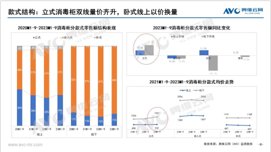 从款式结构上看,嵌入式仍为主流款式,但立式消毒柜的份额正逐渐扩张,增势迅猛。根据奥维云网(AVC)监测数据,2023年1-9月立式消毒柜线上、线下零售额分别同比增长为10.2%、21.4%。立式消毒柜呈双线增长势头,而伴随着这一趋势,其价格也逐渐攀升,可见企业对高端立式消毒柜市场的布局已经开始。