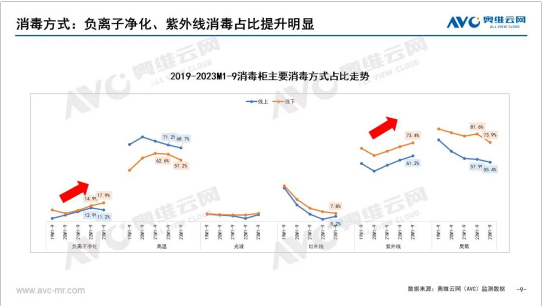 目前,消毒柜仍以高温、紫外线、臭氧消毒为主,其中紫外线消毒的占比提升明显。根据奥维云网(AVC)监测数据,2023年1-9月紫外线消毒线上、线下零售额占比分别为73.4%,61.2%,较上年同期分别提升3.9、3.7个百分点。此外,负离子净化线上占比也有一定程度增长。