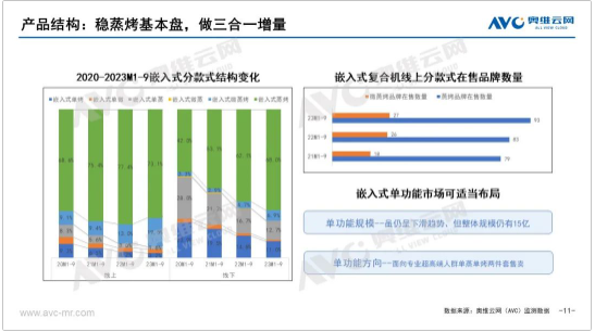 2、嵌入式微蒸烤三合一产品——稳增。随着消费者生活节奏的加快,微波功能快速、即热的特点得到放大,嵌入式微蒸烤三合一产品也迎来快速的渗透。根据奥维云网(AVC)监测数据,2023年1-9月,线上市场嵌入式微蒸烤三合一产品零售额占比19.5%,较同期增长6.5个百分点;线下市场嵌入式微蒸烤三合一产品零售额占比为6.9%,较同期上涨2.2个百分点。
