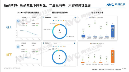 近年来,消毒柜新品数量持续下降。根据奥维云网(AVC)监测数据,2023年1-9月消毒柜线上新品数量132个,同比下降10.3%;线下新品数量78个,同比下降1.4%。新品消毒星级以二星级消毒为主,2023年1-9月新品二星级消毒占比线上、线下分别为69.7%、89.7%。新品容积主要集中在100L及以上,2023年1-9月新品容积≥100的数量分别为92个、67个,占比均在60%以上。