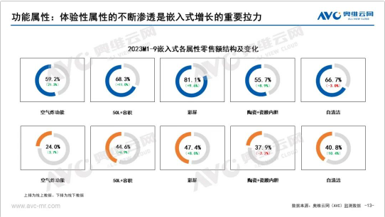 从功能属性看,嵌入式微蒸烤作为品需厨电,体验性属性的不断改善与渗透是保持行业活力、促进行业增长的必然路径,也是消费者的必然要求。根据奥维云网(AVC)监测数据,含有空气炸功能产品、容积50L以上产品、彩屏产品的双线零售额占比均有所提升,其中含空气炸功能产品线上增长尤为明显,2023年1-9月相较于同期零售额占比增加了21.3个百分点。除此以外差异化内胆、腔体自清洁也成为消费者越来越关注的产品卖点。戳→奥维数据罗盘