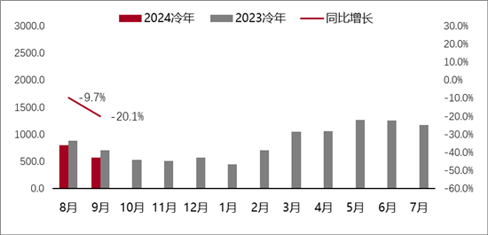 据产业在线监测显示,2023年9月家用空调969.3万台,同比下降5.9%,销售998.9万台,同比下降5.3%,其中内销出货568.1万台,同比下降20.1%,出口出货430.8万台,同比增长25.3%。三季度内外销市场出现较大反转,内销市场来看,终端市场遭遇断崖式下滑后,当前需求处于弱复苏状态;海外市场来看,去库存节奏趋缓,新订单带来持续性修复,低基数效应带动下业绩超预期发展。
