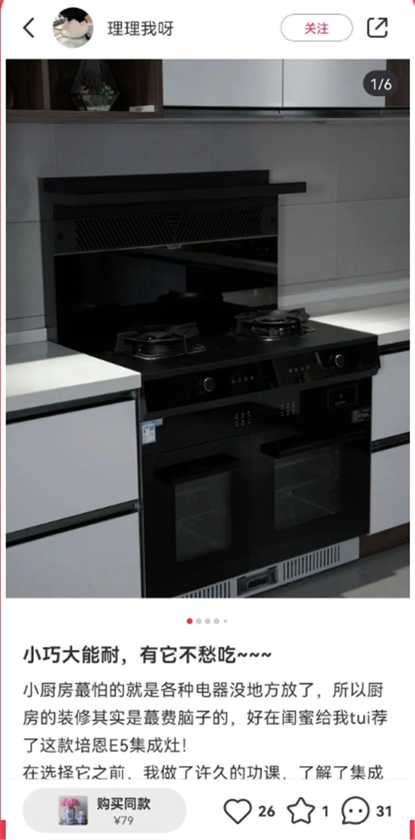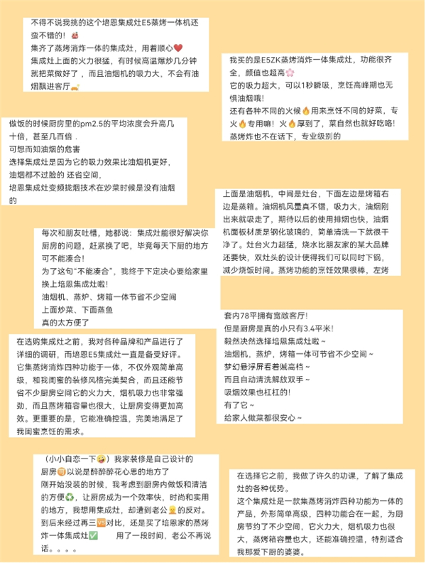 在小红书、抖音等平台,众多的培恩集成灶用户都表示:“培恩E5集成灶将油烟机、燃气灶与蒸烤箱集成在一起,能够很好的节省厨房空间原本小小的厨房瞬间不拥挤!”好评如潮!