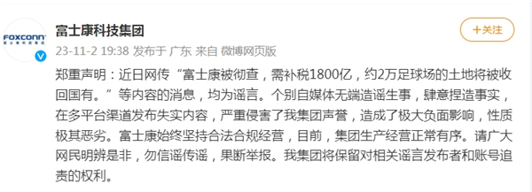 该声明针对的是,富士康被传出遭税务部门税务稽查的传闻。该传闻称,税务部门近期依法对富士康集团在广东、江苏等地的重点企业进行税务稽查,自然资源部门对富士康在河南、湖北等地的重点企业用地情况进行现场调查。