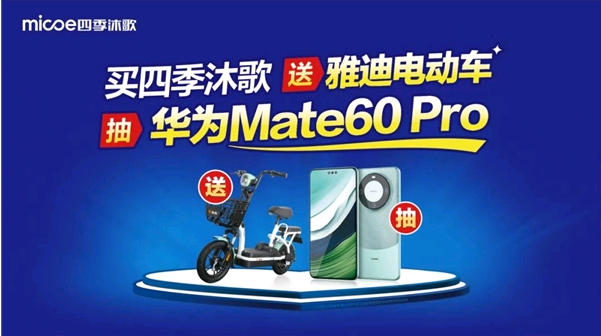 "买四季沐歌送雅迪电动车抽华为Mate60 Pro"第二季火爆来袭!活动期间凡购买四季沐歌空气能、太阳能、厨电、净水机等产品的消费者,只要达到指定金额均可获得雅迪电动车等超值好礼。同时更有机会在11月25日的现场直播中免费抽取火爆全网的华为Mate60 Pro,四季沐歌暖冬大礼包、智能电动晾衣架、太阳能光伏灯等豪礼。
