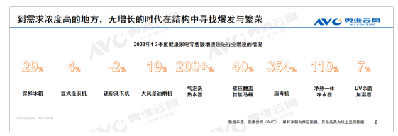 虽然家电市场面临着需求释放压力,但是我们知道市场需求仍在,它不会凭空消失,只是分布不均匀而已。在大盘“无增长”的时期里,想要向市场要增长,那么就要到需求浓度最高的地方去,健康家电便是需求浓度高的细分市场之一。奥维云网数据显示,今年前三季度保鲜冰箱全渠道同比增长29%,大风量油烟机、气泡洗热水器、感应翻盖智能马桶、消毒机、净热一体净水器等品类在线上市场同比增长19%、200%+、40%、354%、110%。