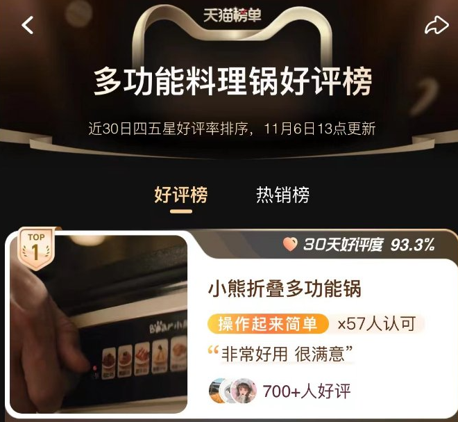 当下,“社交”是生活中不可缺少的一部分,美食更是其情感沟通的桥梁。而具备强社交属性的烹饪电器为用户在社交场景下提供尽可能多的便利。据艺恩营销智库数据显示,42.6%的受访者主要的购买因素在于多功能的产品特性所带来的双手解放。但在实际使用时,虽然产品功能丰富,但使用后的清洗工作,则让不少用户为之头疼,如何才能选购一台真正省心省力的多功能料理锅呢?看看榜单就知道了。天猫双11热卖榜显示,截至11月6日13:00,小熊电器折叠多功能锅位居多功能料理锅位居好评榜TOP1,而小熊电器分体双盘料理锅则位居TOP3。