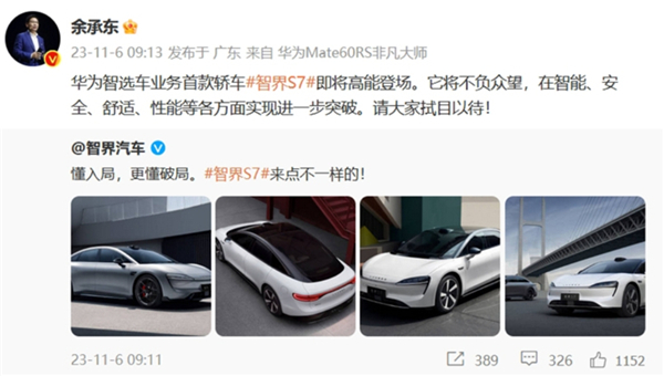 早在今年9月的华为秋季全场景新品发布会上,余承东就正式为智界品牌及智界S7做了官宣,表示智界S7将会是一款“超越特斯拉Model S”的产品。近日,余承东发文表示,智界S7即将高能登场,它将不负众望,在智能、安全、舒适、性能等各方面实现进一步突破。