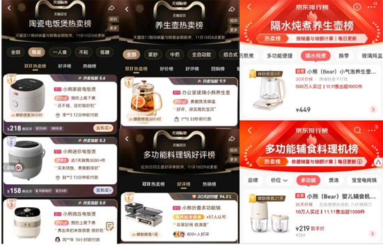 综合天猫、京东两大电商平台榜单来看,用户首选小熊电器。数据显示,截至2023年11月10日10:00,在天猫平台,小熊电器位居养生壶、陶瓷电饭煲、智能保温壶等多个品类榜单TOP1;在京东平台,小熊电器又拿下煮茶器养生壶、玻璃炖盅养生壶、多功能辅食料理机等多个品类榜单TOP1。