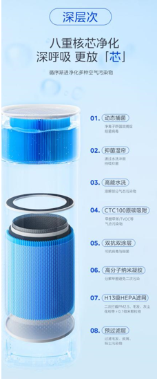 美的星澈空气护理机为此精心设置层层“防线”:当空气进入空气净化器后,先经过预过滤层、H13级HEPA滤网、高分子纳米凝胶、双抗双涂层、CTC100原碳吸附层等5重滤网,经由水洗溶解处理气态、固态污染物,再通过抑菌湿帘过滤常见病菌,最后携带净离子群再度回归室内。8重核芯层层防护,强效针对甲型流感病毒H1N1、肺炎克雷伯氏菌、白色葡萄球菌等常见病菌、气态污染物、甲醛甲苯/TVOC、PM2.5、毛发、灰尘花粉等有害物,深层次净化空气。可截留0.1μm直径颗粒物的严谨、高达99.97%去除率的细腻、1分钟净化10833L空气的效率,美的星澈空气护理机完全可以将室内空气污染与家人剥离开来,打造自然般洁净空间。