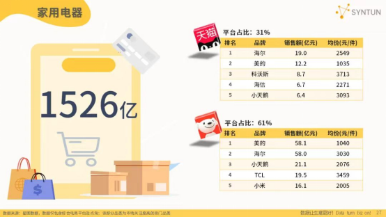 掰开平台公布的数据来看,大家有没有发现,平台特别喜欢公布大幅增长的品类,而这些品论无一例外有两个共同点:第一、基数低;第二是当下的趋势性产品(或者应季产品)。洗烘套装、扫拖机器人、超薄平嵌冰箱、新风空调……这些品类都是近几年保持高速增长的品类。前些年连续公布集成灶销售额增长也是同理。