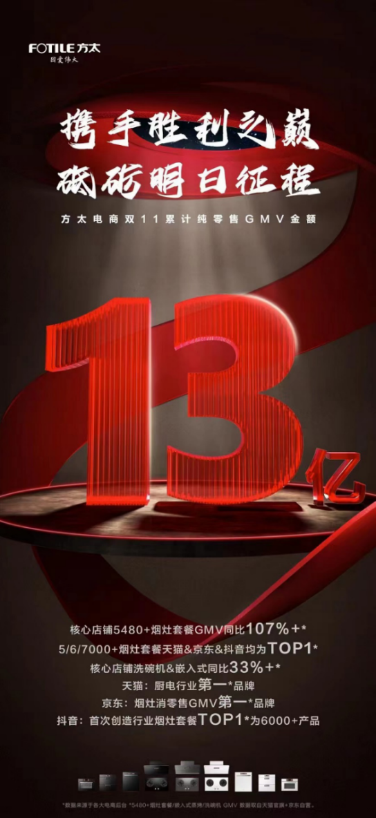 据亿邦动力公布的双11战报显示,2023年双11期间,方太电商全网累计GMV达13亿元。其中,方太电商拿下天猫厨电行业排名第一、京东烟灶消零售GMV第一;在抖音平台,其获得了行业烟灶套餐销售TOP1。而2022年双11,方太电商全网纯零售大约为8.6亿元,2023年同比增长了51.16%。