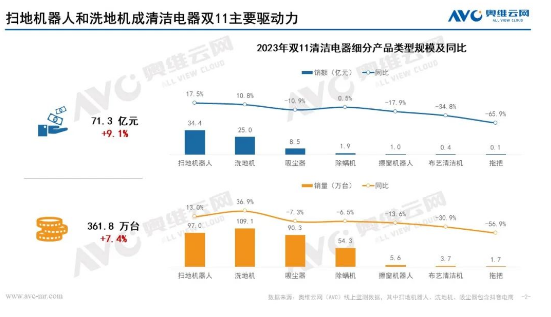 扫地机器人:具备自清洁和自集尘全能款产品全面普及,销额占比达到78%,从热销产品来看,今年新上市的新品走俏,产品聚焦到精细化清洁,产品性能参数得到显著提升,热水洗拖布、边角清洁,机械臂、方形机等。