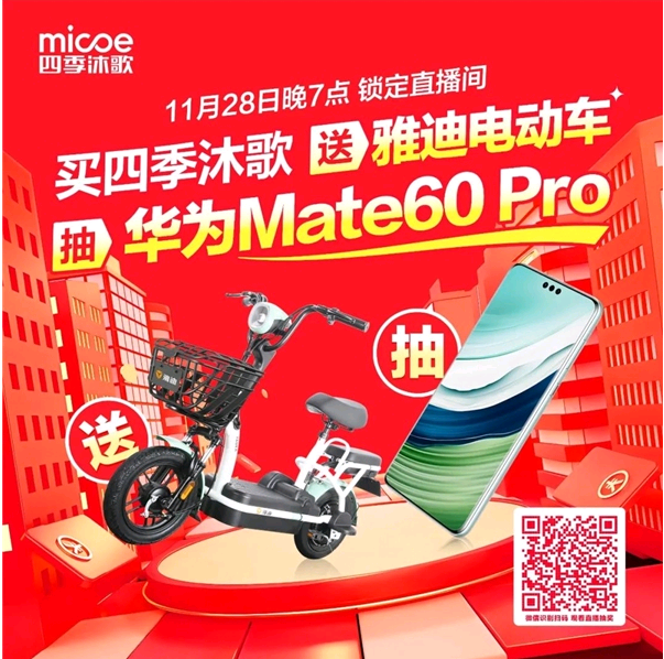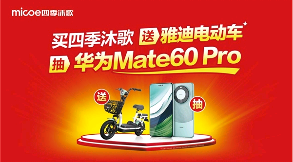 同时,为了给这份寒冬增添更多暖意和惊喜,四季沐歌发起的"买四季沐歌送雅迪电动车抽华为Mate60 Pro"福利季活动火爆进行中,以雅迪电动车、华为Mate60 Pro、暖冬大礼包、智能电动晾衣架、太阳能光伏灯等诚意好礼,让这个冬季添彩!