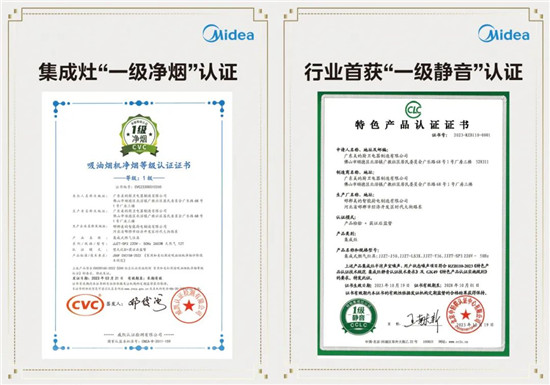 蒸汽洗2.0系统,让美的集成灶能够持久地保持高效吸排油烟。经权威机构认证,搭载净烟科技的多款美的集成灶“符合JSGF CVC158-2022《家用和类似用途吸油烟机净烟评价技术规范》的要求,远超权威认证机构一级净烟标准,荣获“一级净烟”认证证书。此外,针对用户关注的静音效果,美的集成灶采用仿生凹型蜗舌设计,结合航空多段翼叶轮技术,将噪音降至只有47 dB如图书馆般的安静效果,获得北京中轻联认证中心“一级静音”认证。