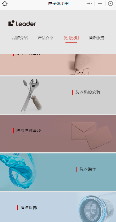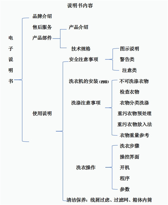 电子说明书分为四个版块:品牌介绍、产品介绍、使用说明和售后服务;使用说明下面,又分为安全注意事项、洗衣机的安装、洗涤注意事项、洗衣操作和清洁保养这5个版块。在这5个板块中,比较实用的是洗涤注意事项和洗衣操作这个两个版块。洗涤注意事项中,分为不可洗涤衣物、检查衣物、衣物分类洗涤、重污衣物预处理,重污衣物放入法、衣物洗涤重量参考;洗衣操作下由分为洗衣步骤、操控界面、开机、程序、参数等5个小项目。