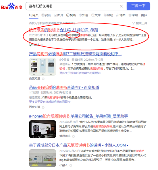 当然,笔者至今仍不确定究竟是统帅的产品说明书漏发,还是电子说明书成为了产品标配。但是在互联网上,以电子说明书代替纸质说明书的家电企业行为,并不少见。在百度搜索“纸质说明书”,第一条内容是“没有纸质说明书合法吗”,而具体内容就是“现在有部分家电的说明书都已经开始采用电子版了……”