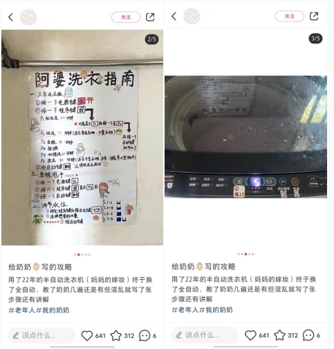 而笔者眼中的“复杂感”并不是个例,在小红书上,就有一些用户为家中老人操作洗衣机专门画了一张简化的说明书,并且贴心的在洗衣机上贴上了步骤指示,让老人能够流畅使用洗衣机产品。并且,电子说明书为手机页面大小,老人阅读也不方便。