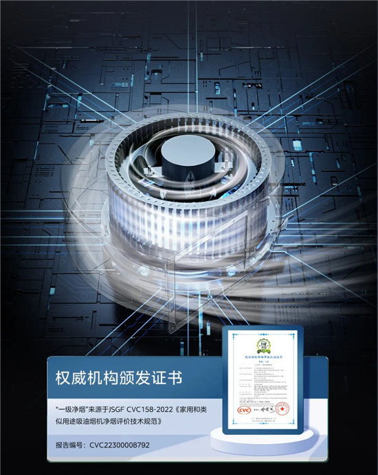 美的无烟感集成灶搭载镜像直排风道,并通过6重油烟分离净烟设计,打造远超权威认证水准的净烟效果。在24m³/min大风量和1080Pa变频强压下,智能感应畅快吸排油烟,让烹饪时呼吸区域的PM2.5浓度下降到50μg/m³。经认证,搭载净烟科技的多款美的无烟感油烟机“符合JSGF CVC158-2022《家用和类似用途吸油烟机净烟评价技术规范》的要求。