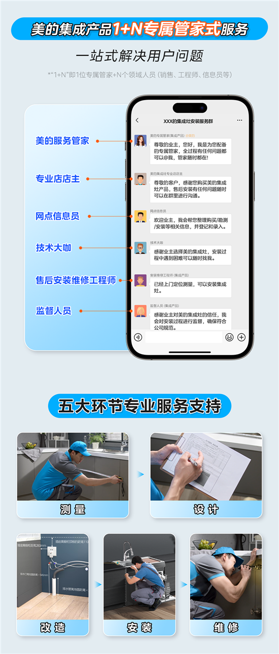 美的集成灶推出“1+N”专属管家式服务,从勘察、购买到安装,1V1专属群对接,1位专属管家+N个领域(销售、工程师等)人员高效协同、24H响应服务、实时了解安装进度、全流程可视;随时解答售后疑问、快速沟通;提供高效协同、快速沟通、专业监理的一站式服务。