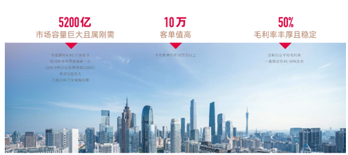 据数据统计,中国拥有4.9亿家庭,每10年左右需要换新一次,市场容量巨大且属刚需,而且平均客单值在10万元以上,平均毛利率一直稳定在45-50%左右,丰厚且稳定。目前行业空间仍在扩容,行业保持着良好的发展态势,预计2023年定制行业规模将超5200亿。