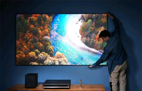 电视画面想要有“电影感”,首先必须要大,激光电视通过主机投射激光光源到屏幕上成像,越大的屏幕对投射距离的要求也就越高。