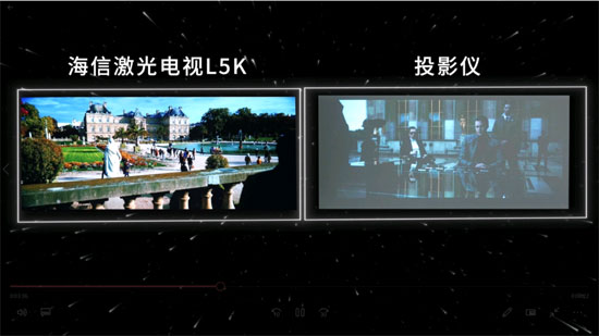 测评博主用海信L5K播放了IMAX Enhanced片源的《疾速追杀4》,发现和液晶电视相比,海信L5K屏幕上电影画面铺满的比例更大,黑边范围小,展现出来的画面内容更多。