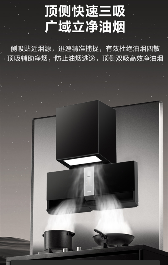 为了保证苏泊尔“强势净烟”的产品性能,苏泊尔油烟机AI60在吸油烟机固有形态基础上进行了改版升级。吸烟口距烟源仅30cm,在油烟扩散之前就筑起吸烟区,近距离带走油烟,近距快吸杜绝油外溢的可能。同时融合顶吸烟机和侧吸烟机双重优势,在顶部以及侧边构建三个进风口,侧面低位强劲吸烟,顶部捕捉逃逸油烟,让爆炒产生的大油烟无从逃逸,发挥1+1>2的效果,实现真正的“无烟厨房”。