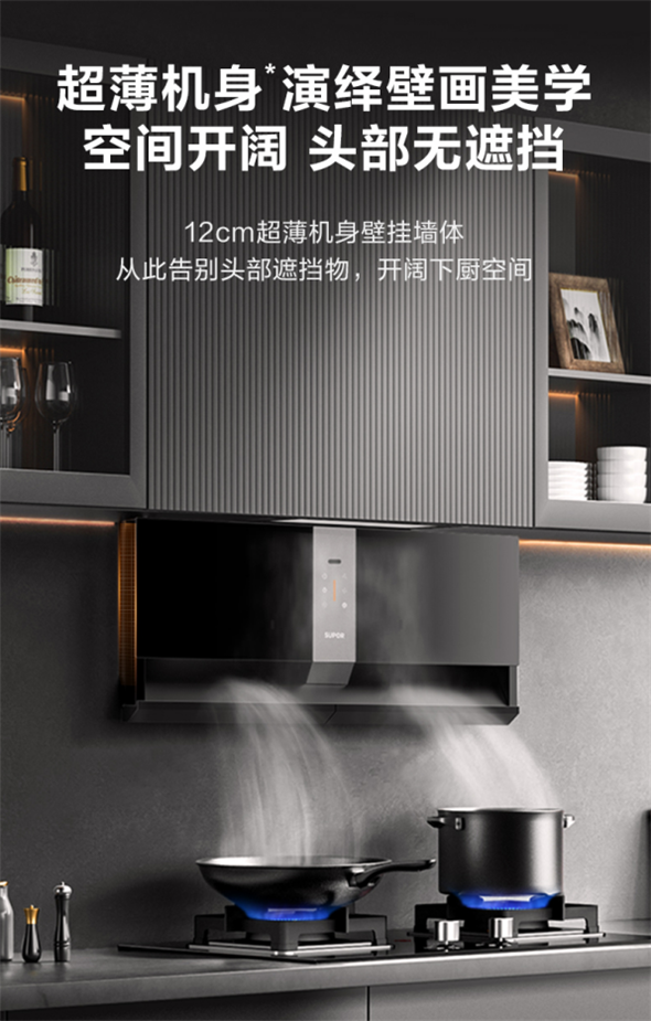 苏泊尔在深刻洞悉消费痛点的同时,科学分析新产品的可行性,推出了苏泊尔超薄三吸油烟机AI60。超薄机身是将风机放在油烟机顶部的风道中,进风口部分本身做薄的设计。苏泊尔吸油烟机AI60的超薄机身仅12cm,如同一幅精致的壁画般悬挂在厨房中,精巧设计的纤薄机身能够完美适配市面主流橱柜,提升空间利用率,厨房转化为整体家居的一小部分,与家居设计相映成趣。