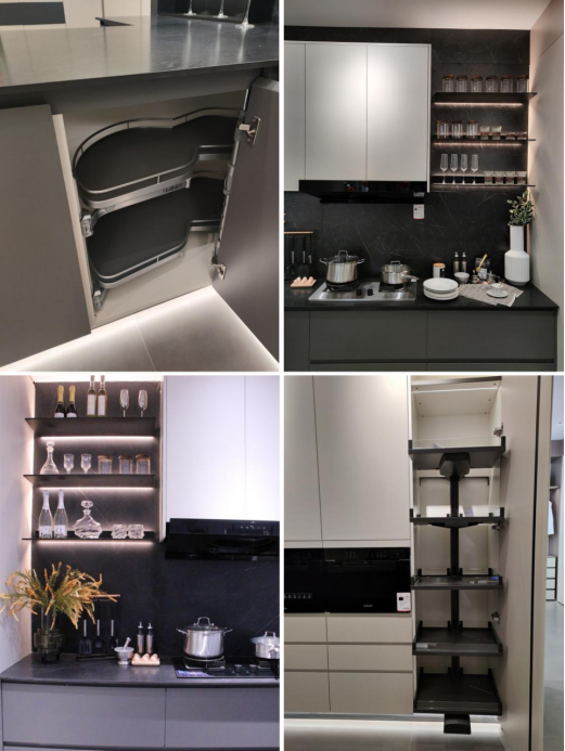 厨房作为全家杂乱物品最多的区域,收纳真的是一项非常艰巨的任务。橱柜的收纳主要分四部分:吊柜、台面和墙面、地柜,高柜。做橱柜千万不要贪图满档,而是要恰到好处设计。
