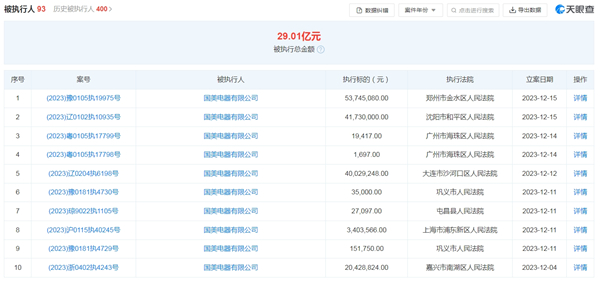 12月18日,据天眼查App显示,12月15日,国美电器有限公司新增2条被执行人信息,执行标的合计9547万余元,两案件被执行人还分别包括河南永乐生活电器有限公司、沈阳国美电器有限公司,案由为金融借款合同纠纷等,执行法院分别为郑州市金水区人民法院、沈阳市和平区人民法院。